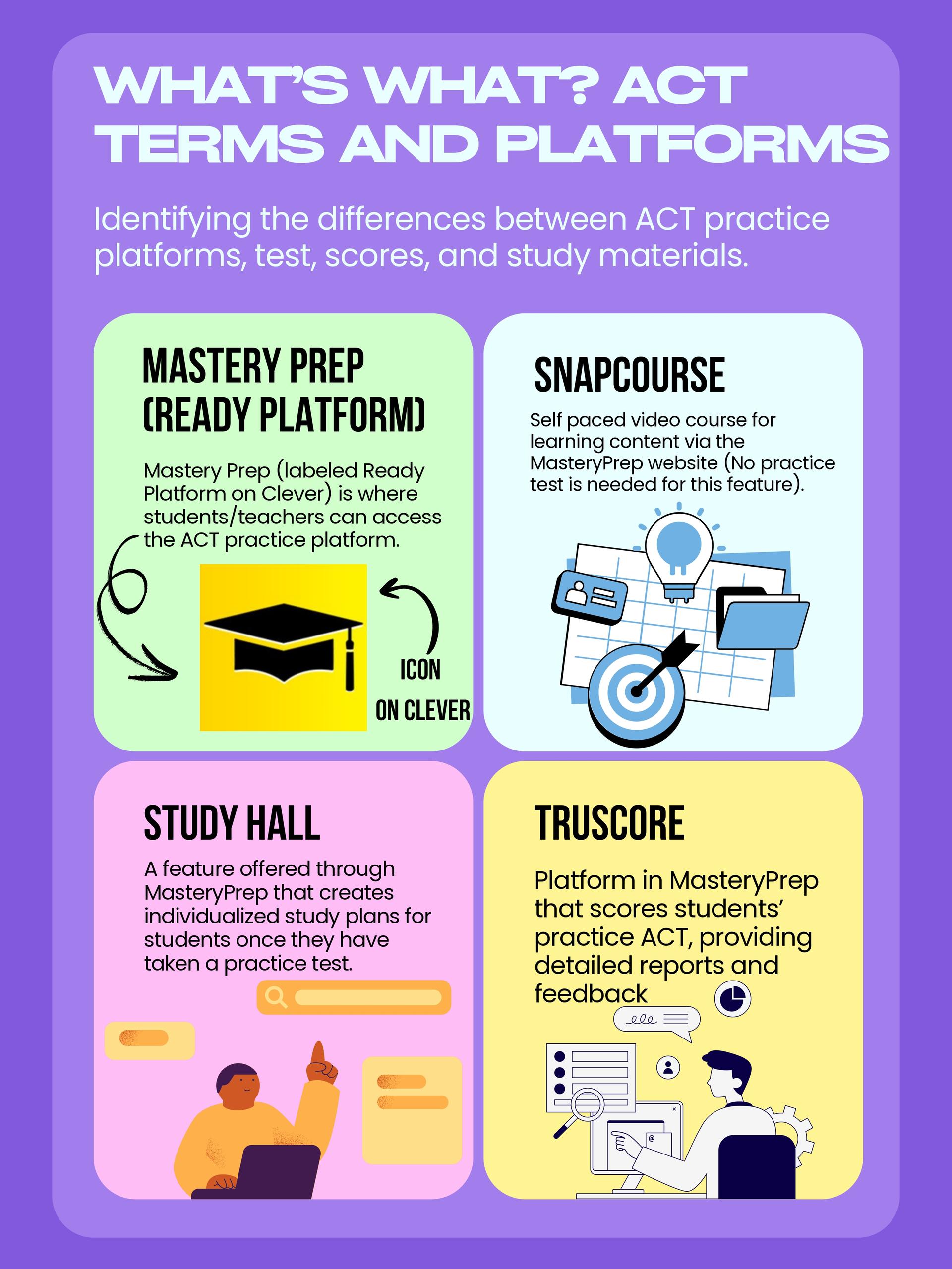 Ready Platform is accessible to all students. Students will need to log into their Clever and look for the grad hat icon. Students will be working on this platform in Soar, but they can also work on it outside of school. There are 3 platforms in Mastery Prep: TruScore (practice tests), Study Hall (Skill Review) and Snapcourse (Online course). See graphic below.