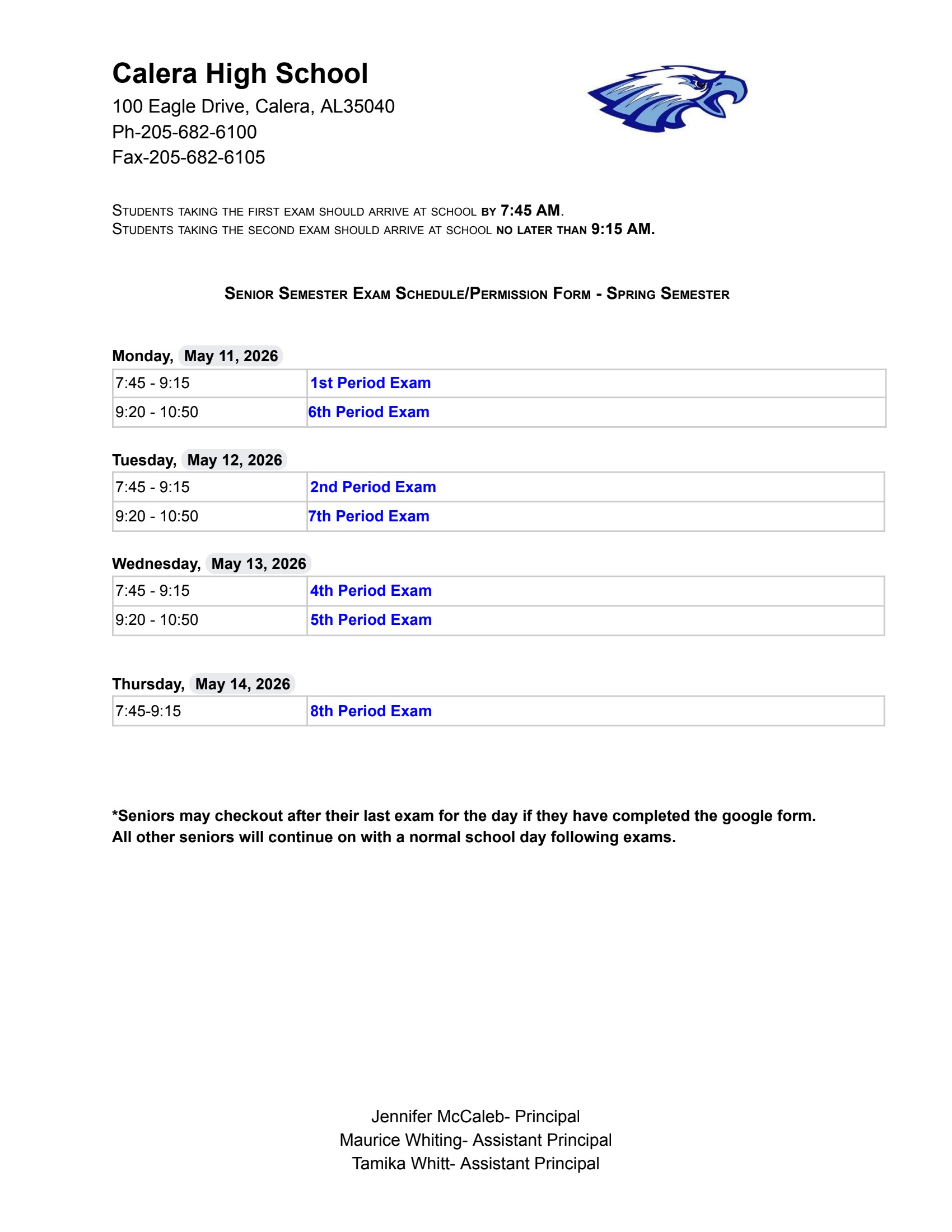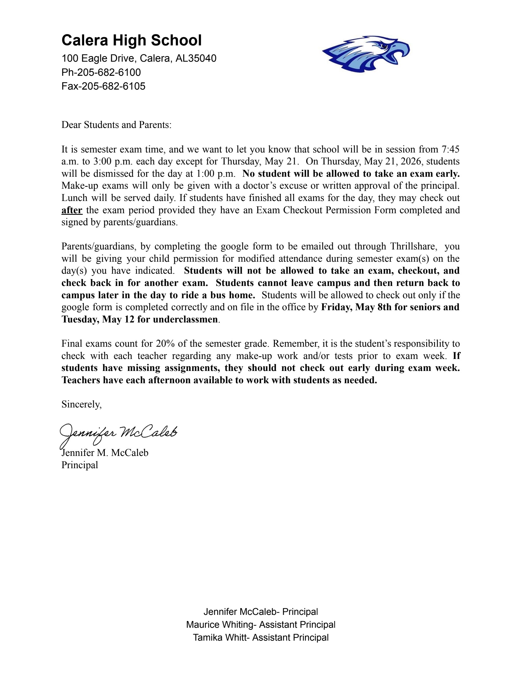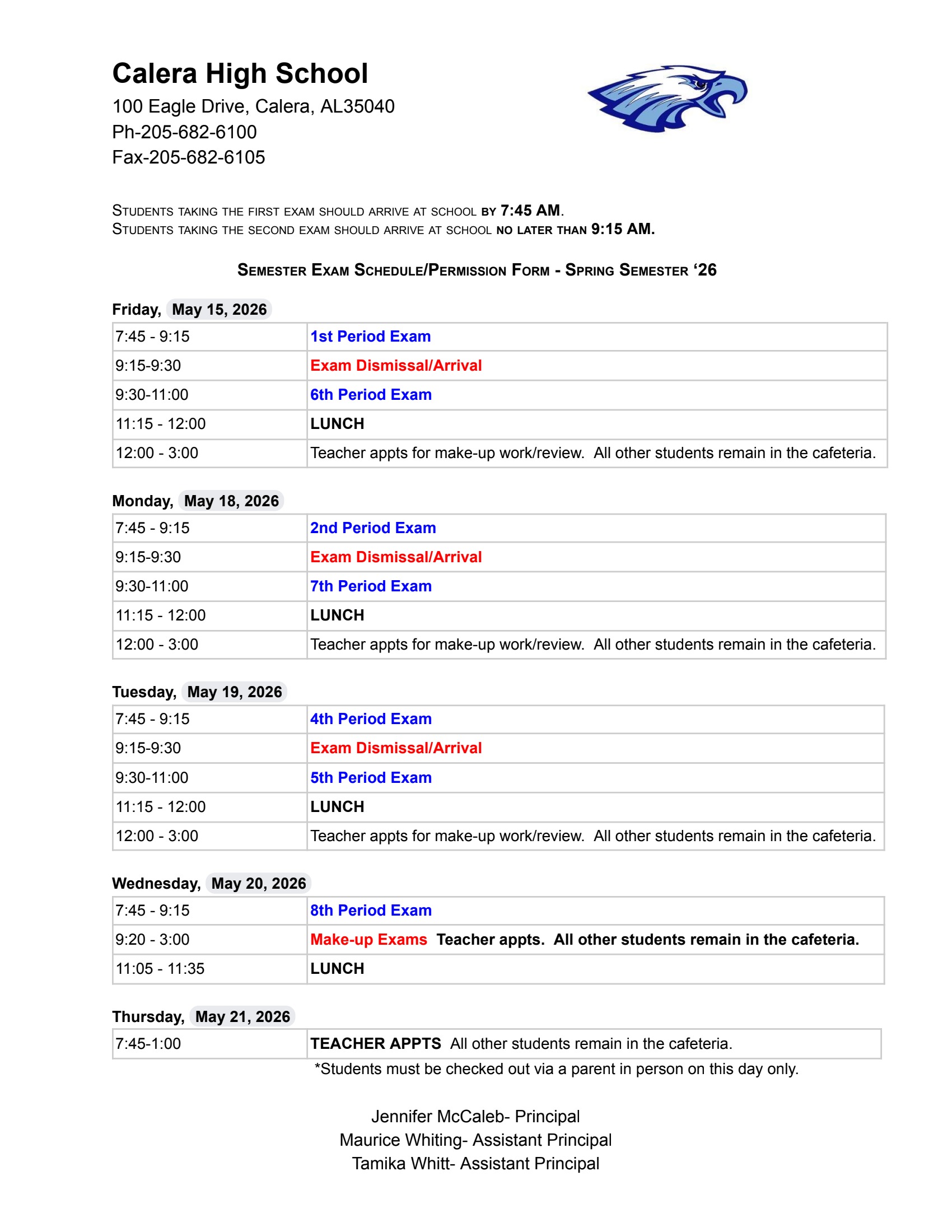 Drop Off Items: Calera High does NOT accept drop off items for students from parents/family/friends, etc in the front office. Please make sure you student has everything needed for the school day and for any after school events before he or she leaves for school in the morning.