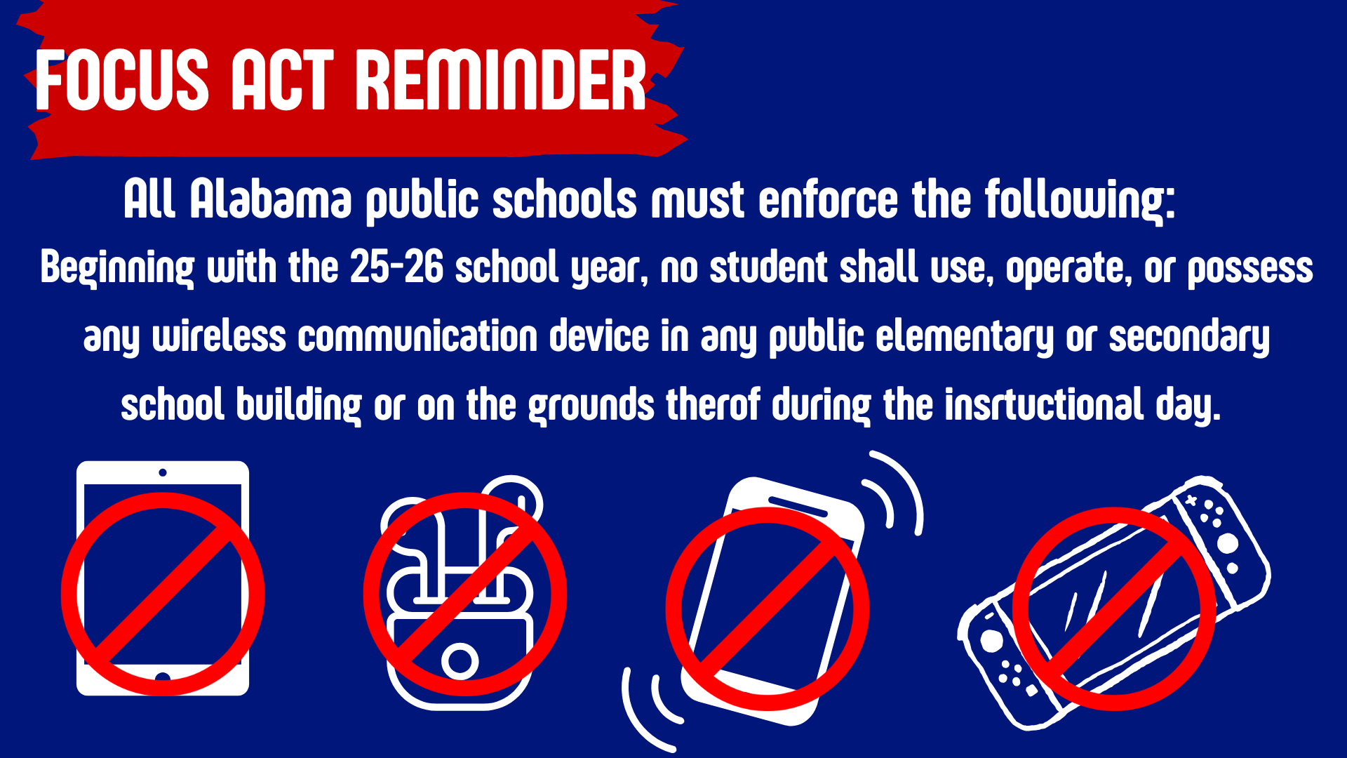 Cellphones: According to the FOCUS ACT, students are not allowed to have cell phones, smart watches, headphones, earbuds, and Meta glasses during the school day. They should be stored in their locker or left in their vehicle.
