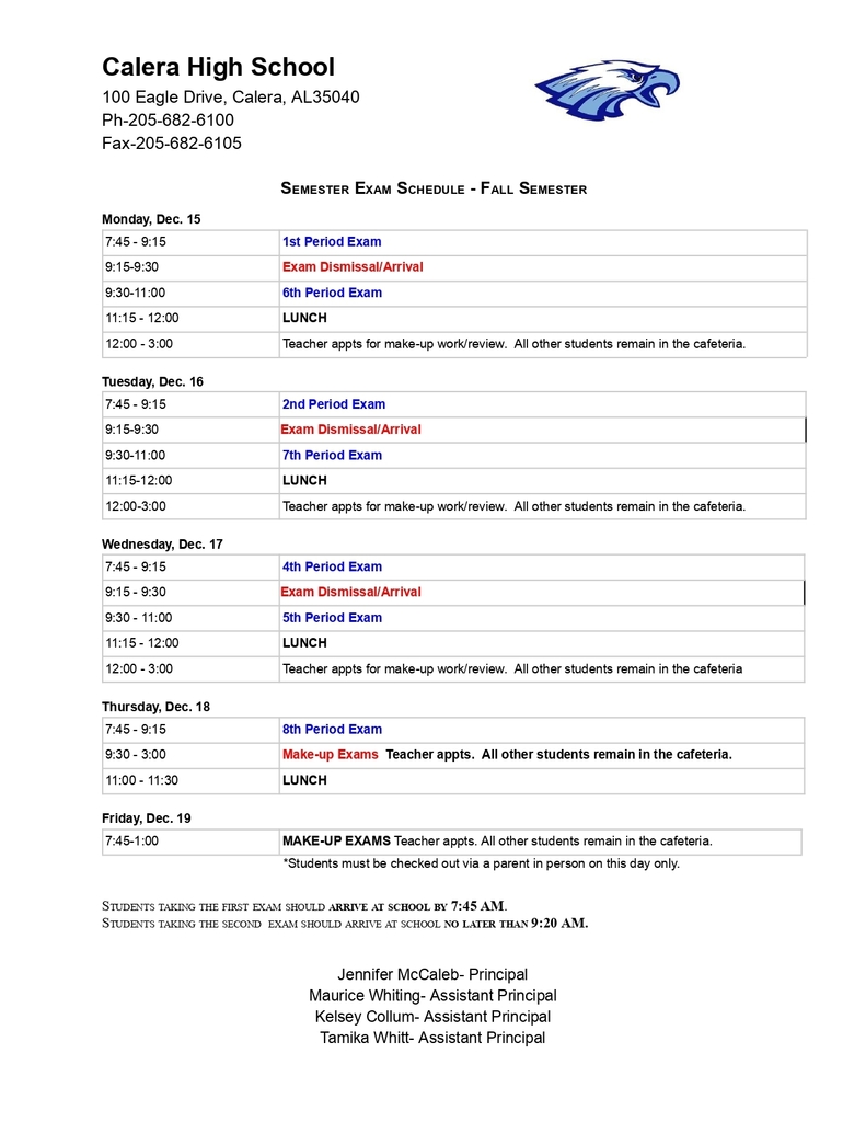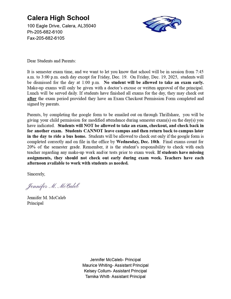 Drop Off Items: Calera High does NOT accept drop off items for students from parents/family/friends, etc in the front office. Please make sure you student has everything needed for the school day and for any after school events before he or she leaves for school in the morning.