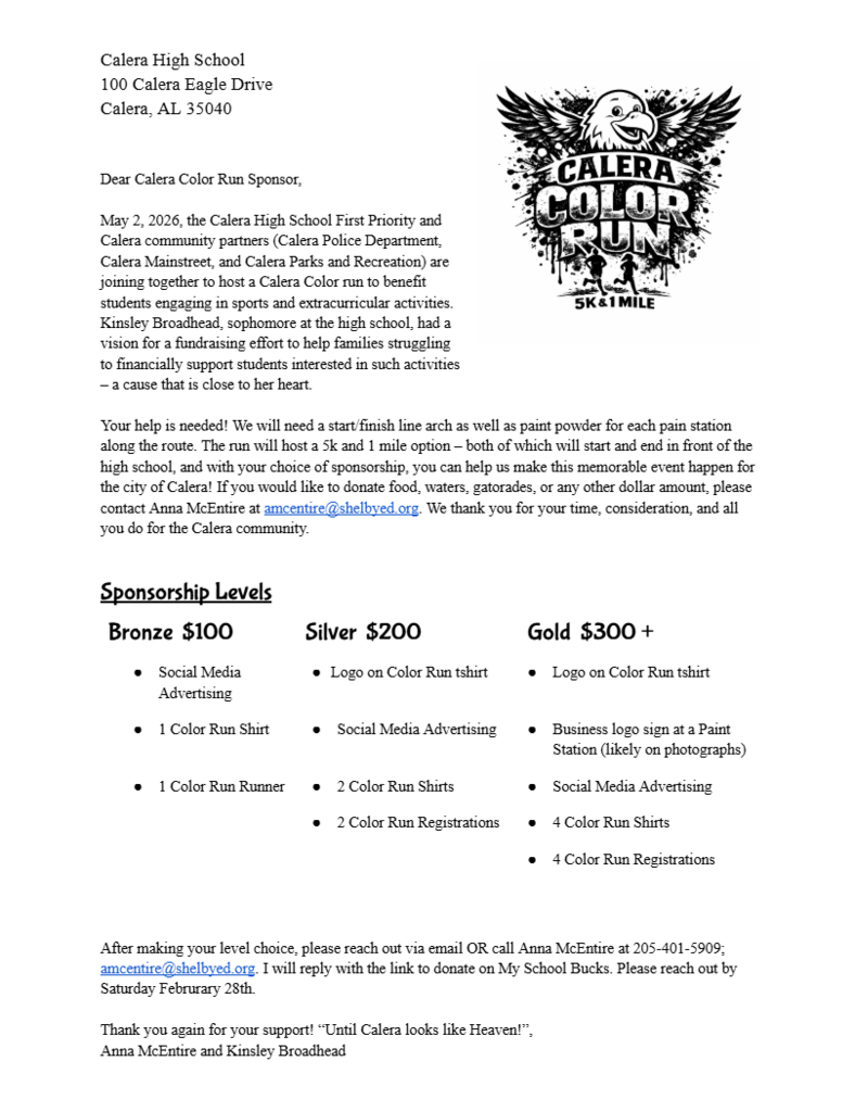 Drop Off Items: Calera High does NOT accept drop off items for students from parents/family/friends, etc in the front office. Please make sure you student has everything needed for the school day and for any after school events before he or she leaves for school in the morning.